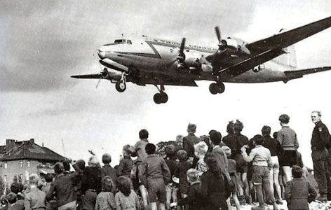 | Berliners watch a Troop Carrier Group C-54 land at Templehof Airport, 1948. |
